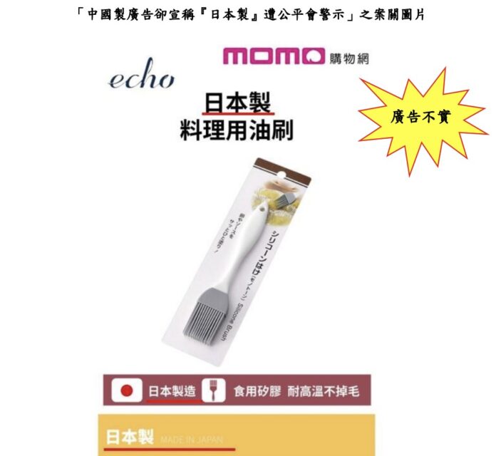 公平交易委員會召開第1766次委員會議,針對「日本ECHO料理用油刷」廣告標示不實一案作出處理。青琦實業有限公司於momo購物網販售該商品時,廣告中宣稱為「日本製」、「日本製造」及「MADE IN JAPAN」,但實際產品產地為中國,與事實不符,違反《公平交易法》第21條第1項規定。公平會考量違規情節尚屬輕微,對青琦公司及富邦媒體公司發函警示。