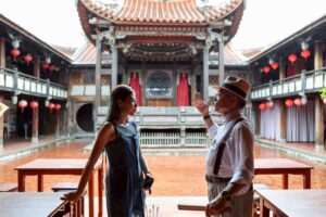 ▲ 圖說:霧峰林家第9代林俊明向香港KOL米紙介紹林家花園大花廳。