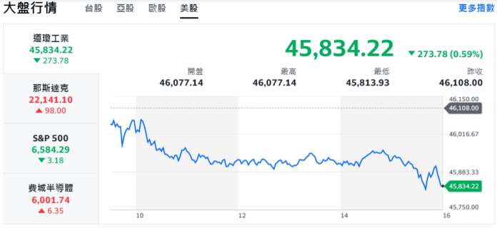 美股上週五走勢分歧,台股週一(15日)呈現高檔震盪,電子權值股普遍熄火,盤面資金聚焦記憶體、第三代半導體、散熱等族群,加權指數盤中跌逾百點,最低回測25,284點,預估成交量約4200億元。