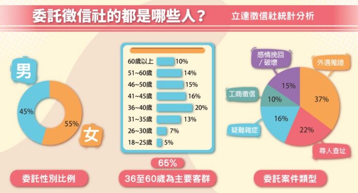 從立達徵信社統計數據來看,徵信社的主要客群多集中在36至60歲之間,這個年齡層的人往往同時承擔家庭與事業的壓力,遇到問題時,更傾向尋求專業協助。謝智博亦指出:「徵信委託人的共同點,在於他們都面臨資訊不對等的困境。無論身份、性別或職業,當事人需要的都是一個可信、可靠的第三方,來填補證據上的不足或邏輯上的盲點。」