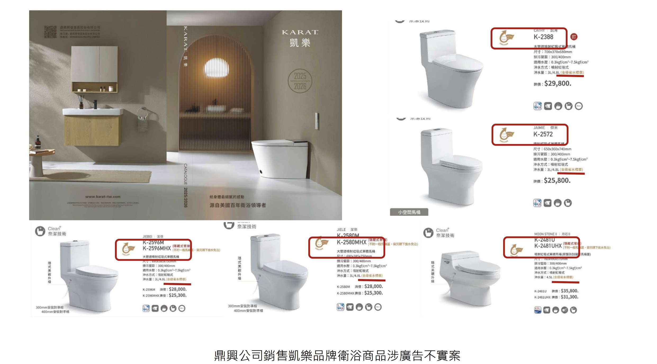 公平會指出,鼎興公司凱樂品牌多款型號,包括K-2388、K-2572、K-2481UHX、K-2596MHX及K-2580MHX等馬桶商品,在型錄中以文字及圖示方式標註「金級省水標章」。此舉容易讓消費者誤以為商品已獲得金級省水認證,並認定該產品比一般「普級省水標章」商品具有更優異的省水效能。