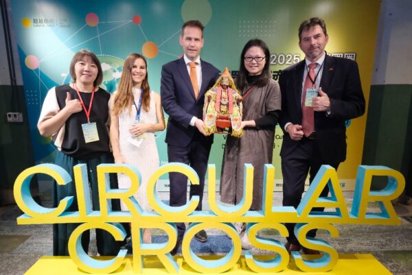 圖: 超越圈圈循環經濟博覽會策展人 賴懿容協同荷蘭在台辦事處 副代表 馬得斯及荷蘭循環熱點基金會執行長及營運長與媽祖同行參展商串聯文化能量與低碳旅行。