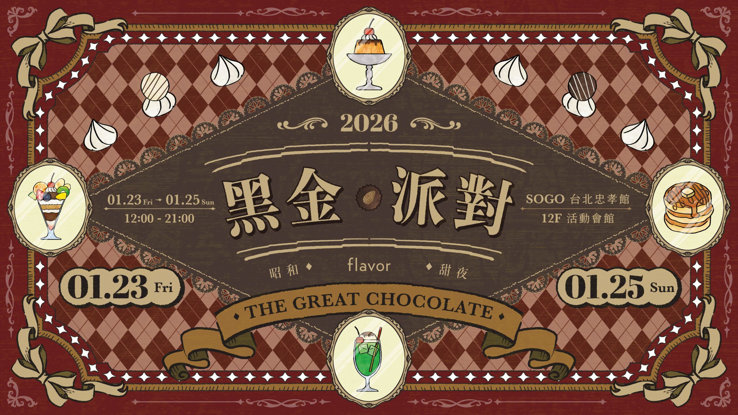 2026 年初最受矚目的巧克力年度盛事《黑金派對 2026:昭和甜夜》,將於 1 月 23 日至 25 日在遠東 SOGO 台北忠孝館 12 樓活動會館限時登場。活動邁入第六屆,今年首度以「日系昭和」為策展主題,結合昭和古董陳設、和洋折衷甜點與全球精品可可,打造一場橫跨時代、從視覺到味蕾全面沉浸的巧克力盛宴。