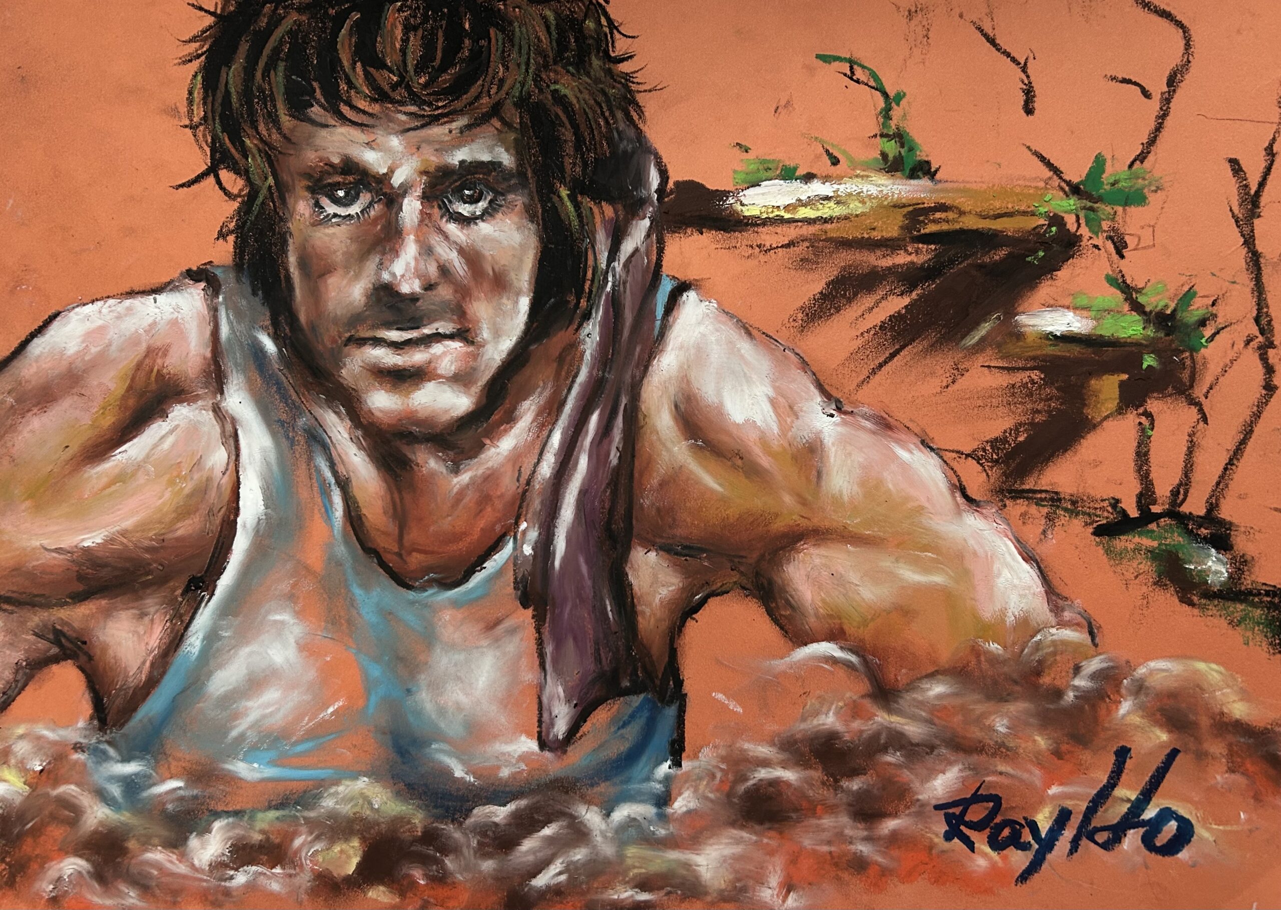 藍波披着上校的大衣, 頭上依舊綁着布條, 臉上還留着長長的血跡, 随着上校走出室外,猛一回頭, 畫面定格, 面無表情, 犀利的双眼, 剛毅的嘴角, 似乎還有一股不服輸的怨氣。