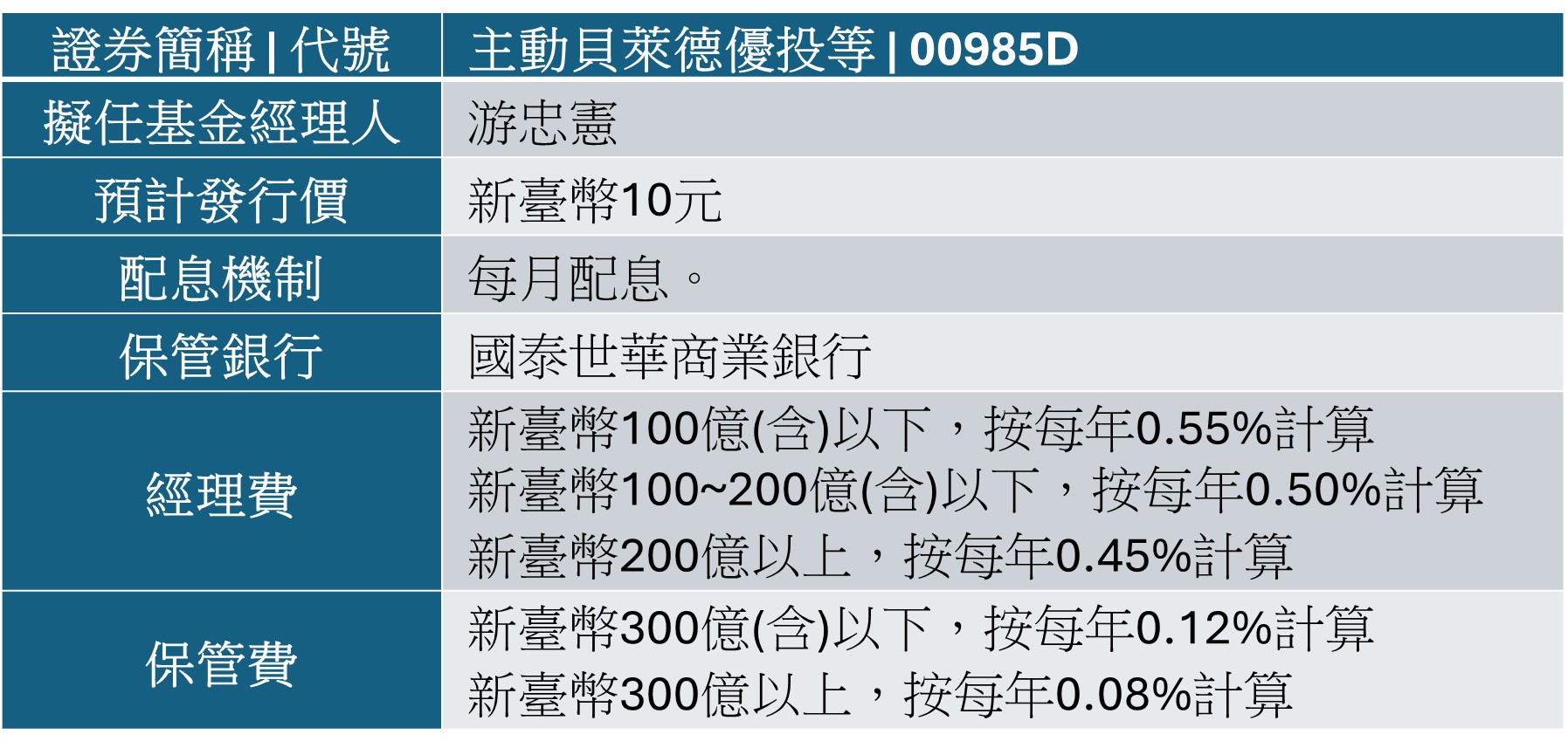 在投資策略上,他進一步提到,00985D依據「品質、價值與市場動態」三大面向進行選債,並透過主動調整投資組合與運用衍生性工具策略,優化收益來源與投資效率。利率環境變化快速的情況下,主動式管理可讓投資組合更靈活因應市場變動,亦能協助投資人在不同景氣循環中維持相對穩健的收益配置。